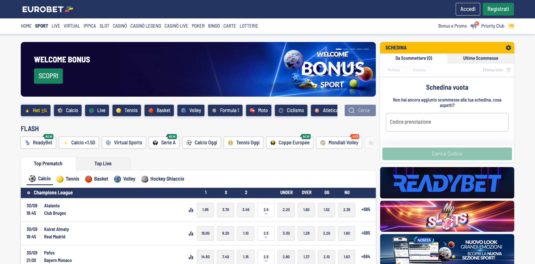 L’offerta sportiva di Eurobet Scommesseè tra le più complete nel panorama italiano, con una copertura estesa di eventi nazionali e internazionali. Il sito dedica particolare attenzione al calcio, con quote competitive su Serie A, Champions League, Premier League e principali tornei europei
