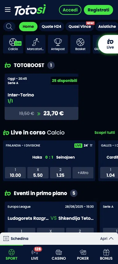 Su Totosì.it, i nuovi utenti possono approfittare di un Bonus Benvenuto Sport del 100% fino a 100€.
